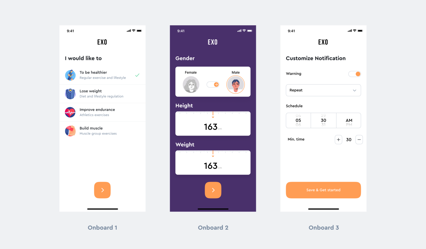 In this stage, users will choose their intention, provide info about their body measurement and customize the notification on how they will be remembered to achieve daily goals.