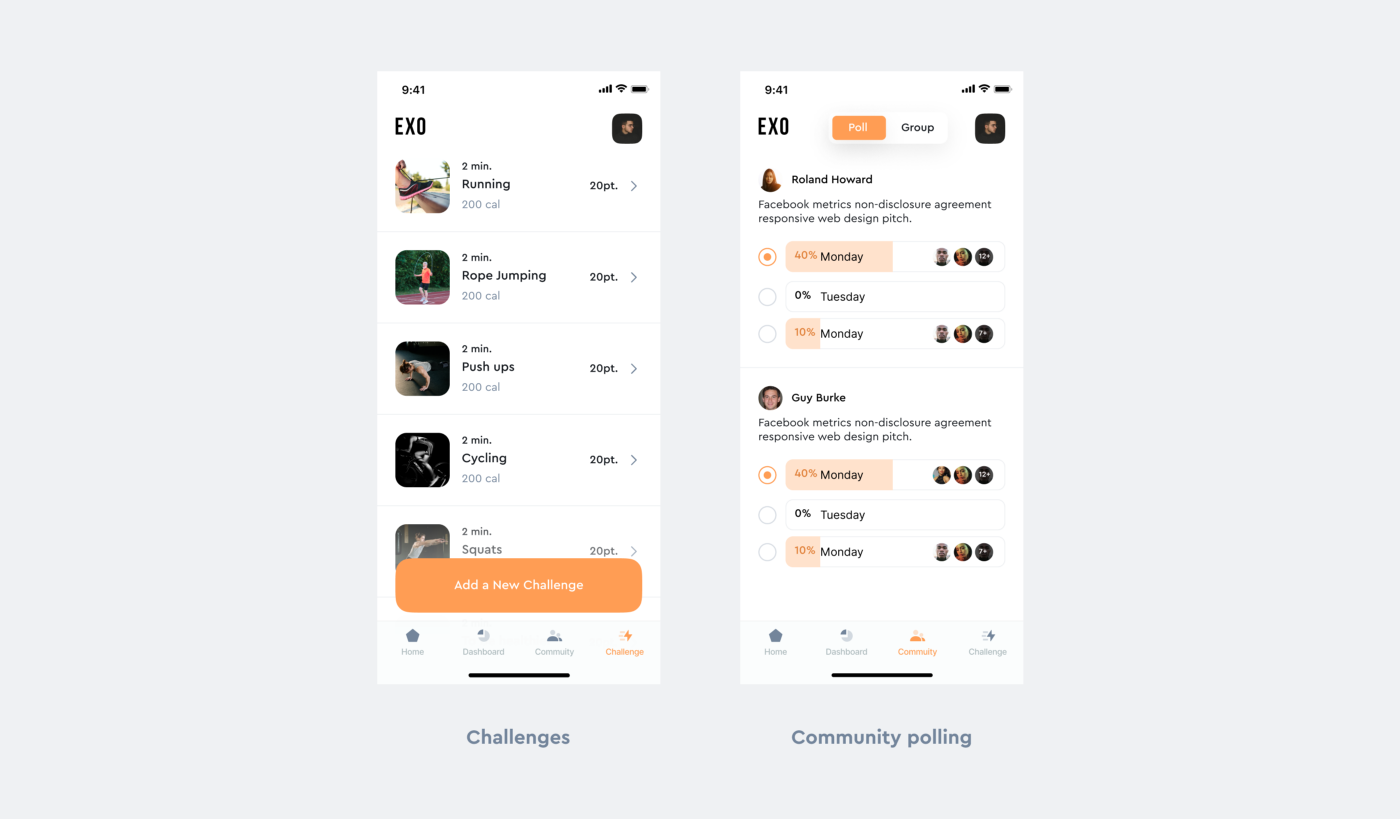 Gamified this task by providing Daily challenges to meet on a daily basis which will allure users and engage them to achieve and make on the top list of the leader board. Also a polling system inside the community for a group workout.