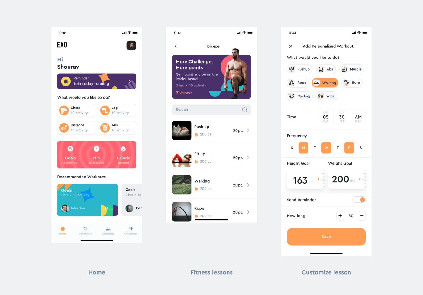 On the home page, users can see what's their reminder for upcoming polling events. later what they want to work out on. A sneak peeks of their goals, minutes spent, and burnt calories. After that, they will see some workout lessons provided by special mentors. Users can also able to create personalized workout lessons.